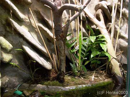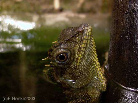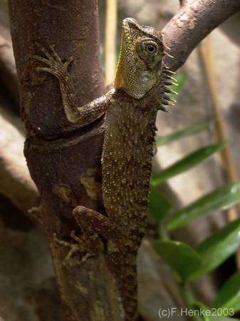 Verhalten und Haltung im Terrarium: Die Nackenstachler leben überwiegend in Gruppen im Stammbereich und auf dem Boden. Bei Gefahr verlassen sich die Tiere auf ihre Tarnung und verharren regungslos, werden sie entdeckt zeigen sie Drohgebärden, stellen sich auf, blähen den Kehlsack auf und sperren das Maul auf. Schreiten sie zur Flucht, verstecken sie sich zwischen Wurzeln oder unter Felsen. Sie bevorzugen die Nähe von flachen Gewässern, und harren oft lange im fließenden Wasser aus. Gute Schwimmer sind sie allerdings nicht! Sie sind zwar stark an Gewässer gebunden, bei der Einrichtung des Terrariums sollte aber der Wasserteil eine Wassertiefe von 15cm nicht überschreiten. Besonders nachts, wenn die Tiere sich schlecht orientieren können, besteht die Gefahr des Ertrinken. Aufgrund ihrer Lebensweise werden Sonnenplätze nicht benötigt. Es sollten allerdings mehrere Temperaturzonen im Terrarium vorhanden sein. Die Einrichtung besteht aus senkrechten und waagerechten, armdicken Ästen und Wurzeln. Eine üppige Bepflanzung mit Kletterpflanzen, Farnen und Epiphyten bietet den Tieren die nötige Tarnung, und entspricht dem natürlichen Habitat. Ein Wasserteil sollte wie erwähnt stets vorhanden sein. Zusammen mit der biotopgerechten Bepflanzung wird so das richtige Mikroklima ermöglicht. Auf die Wasserqualität muss geachtet werden, da die Tiere das Wasser zum Baden und Trinken verwenden. Das Bodensubstrat besteht aus einem Blumenerde- Sandgemisch. Die Weibchen benötigen dabei zur Eiablage eine Bodentiefe von mindestens 15 bis 20cm. Die Behältergröße richtet sich nach der Anzahl der Tiere. Ein Besatz mit einem Männchen und zwei Weibchen erfordert ein Terrarium von mindestens 100x60x120cm (L/T/H). Mehrere Männchen können nur in Großterrarien mit optimaler Einrichtung gehalten werden. Da die Tiere eine hohe Luftfeuchtigkeit benötigen, bietet sich die Verwendung einer Regen- und Nebelanlage an. Nackenstachler genießen es überbraust zu werden, dabei reinigen sie sich ausgiebig. In diesem Terrarium wurden A. crucigera und A. capra erfolgreich nachgezogen. Foto Acanthosaura capra.