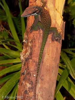 Gestalt: Die Männchen erreichen eine Maximalgröße von 25cm, die Weibchen 18cm. Anolis allisoni, wie auch A.carolinensis und A.porcatus, verfügen über die Fähigkeit in kürzester Zeit ihr Farbkleid von hellen Grüntönen, in dunkle Brauntöne zu wechseln. Je nach Stimmung des Männchen erscheinen in der Kopfregion herrliche Blautöne und die Iris färbt sich cremegelb. Das rechte Bild zeigt ein Weibchen, welches sich farblich an den Untergrund anpaßt. Links ist ein Männchen in Erregung mit aufgestelltem Rückenkamm zu sehen. Die Kehlfahne ist weinrot bis violett gefärbt.