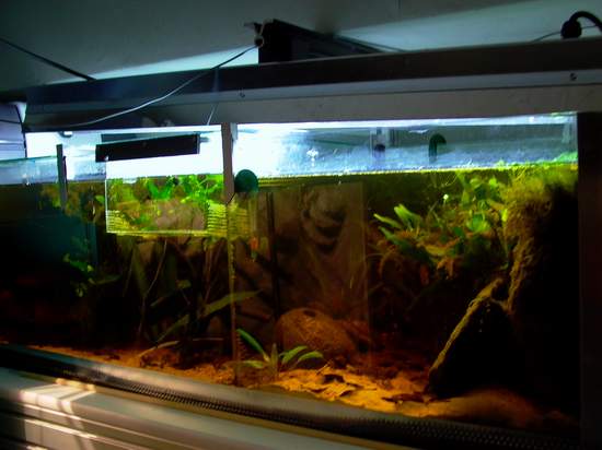 Alle gehaltenen Arten sind ausschließlich in Gewässern mit niedrigem PH Werten zu finden. Die richtigen Wasserwerte werden mit CO² Anlagen und in den Zuchtbecken der Zwergbuntbarsche kommen Erlenzapfen und Eichenlaub zum Einsatz. Bei der Zugabe von Erlenzapfen sollte man die Menge zunächst erst vorsichtig austesten, denn die abgegebenenFarbstoffe verdunkeln das Wasser, wodurch die Wasserpflanzen über einen längeren Zeitraum Schaden nehmen. Den PH Wert kann man dennoch nur bei sehr weichen Wasser mit diesen Naturprodukten beeinflussen. In meinen Aquarien konnte der PH Wert von 7,5 auf 6,5 abgesenkt werden, wertvoller ist die antibakterielle Wirkung einiger Stoffe, die aus den Erlenzapfen im Wasser gelöst werden.. Den PH Wert beeinflußt man effektiver mit der Zugabe von CO². Im Wasserteil des großen Paludariums wäre ein Einfärben des Wassers (Schwarzwassermillieu) bei einer Wassertiefe von 60cm nur mit großen Beleuchtungsaufwand zu realisieren.