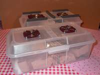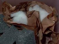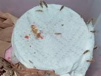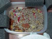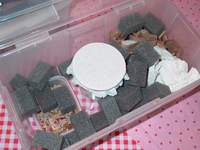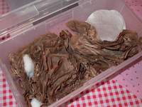 Wir stellen nun die Futterschale (Bild 1) und den Wasserbecher (Bild 2) in den Zuchtbehälter. Danach füllen wir den Behälter mit Eierkartons, Klopapierrollen, oder Verpackungspapier welche den Tieren als Lebensraum dienen. In einer meiner Zuchten benutze ich zusätzlich Schaumstoffklötzchen, die sehr haltbar sind. Für die Eiablage geben wir noch einen Baumwollwattebausch (Zellstoff) in den Behälter (Bild 3).