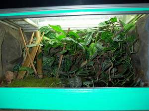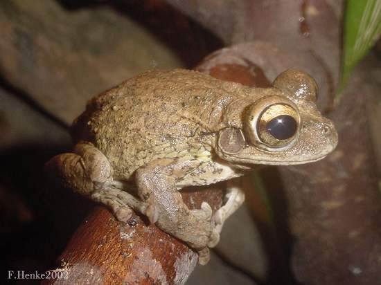 Haltung und Zucht: Die Tiere sind in einem hohen Regenwaldterrarium (Paludarium) mit Wasserteil ( es reicht aber auch eine Wasserschale) untergebracht. Man sollte einen Klimarythmus von Regen- und Trockenzeit schaffen. Dies funktioniert natürlich am besten mit zwei Terrarien: eines mit hoher Luftfeuchtigkeit und großem, geheiztem Wasserteil, das andere eher trocken mit einer kleinen ungeheizten Wasserstelle. Gerade im trockenen Terrarium können die Frösche auch bei Zimmertemperatur gehalten werden. Setzt man die Tiere nach der Trockenphase in das feuchtwarme Terrarium, suchen sie meist noch in der gleichen Nacht den Wasserteil zur Laichabgabe auf. Die Entwicklungszeit der Kaulquappen richtet sich stark nach der Wassertemperatur. Bei 26-27C°gingen die ersten Jungfrösche schon nach 30 Tagen an Land. Andere Kaulquappen verweilten in einem ungeheizten kleinen Wasserteil bei 20-22C° sieben Monate. Als eine Heizung eingebracht wurde, entwickelten sich auch diese Kaulquappen bei 27C° innerhalb der nächsten 30 Tagen zum Frosch. So kann man bei einer größeren Zucht natürlich die Kaulquappen auf mehrere Behälter mit verschiedenen Temperaturen verteilen, und so eine Froschschwemme und Übervölkerung der Aufzuchtterrarien verhindern. Die Kaulquappen sind einfach zu ernähren. Sie fressen Algen, überbrühten Salat, Gurkenscheiben und Fischfutter aller Art. Die jungen Frösche fressen Drosophila, Ofenfischchen, Buffalo Larven, und bald auch Wachsmottenraupen. Im Sommer ist natürlich Wiesenplankton als Beigabe hervorragend geeignet. Eine durchgehende Fütterung ist allerdings wohl nur mit Futtertierzuchten, insbesondere Drosophila, aufrecht zu erhalten.